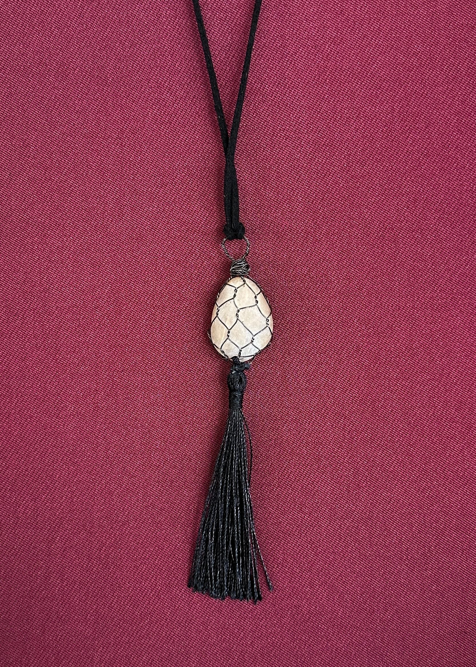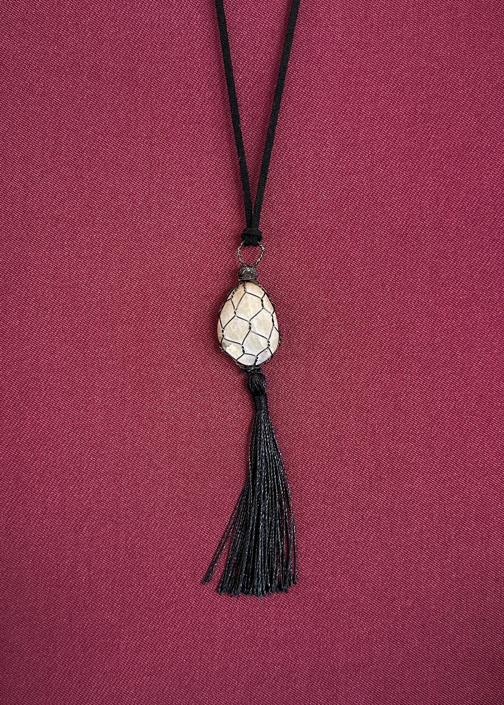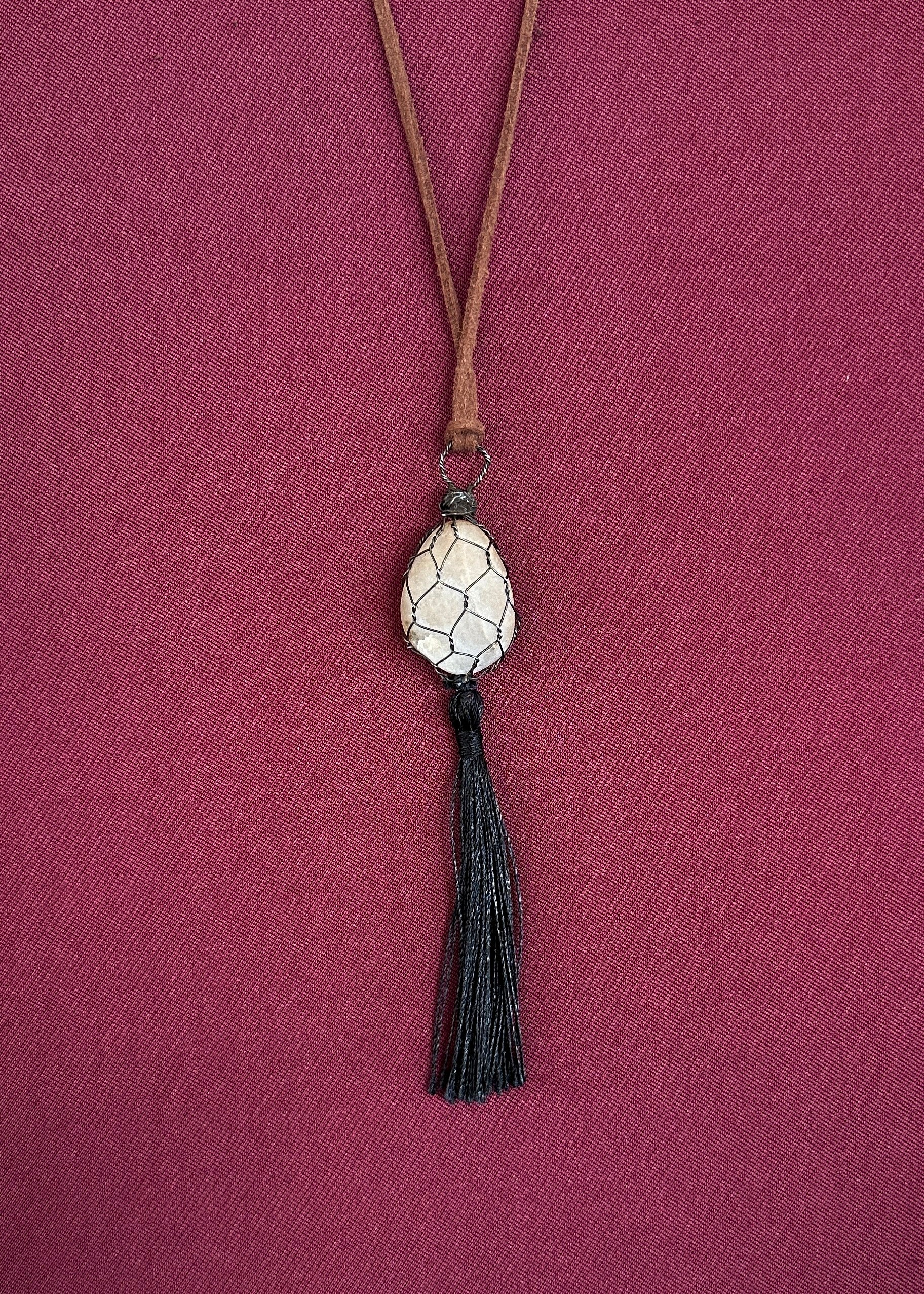 A mix of stone, wire, silky yarn, and leather come together in this one-of-one pendant. The soft leather cord measures 20 inches and adjusts easily for the perfect fit. Hand-wired and strung in New York City.