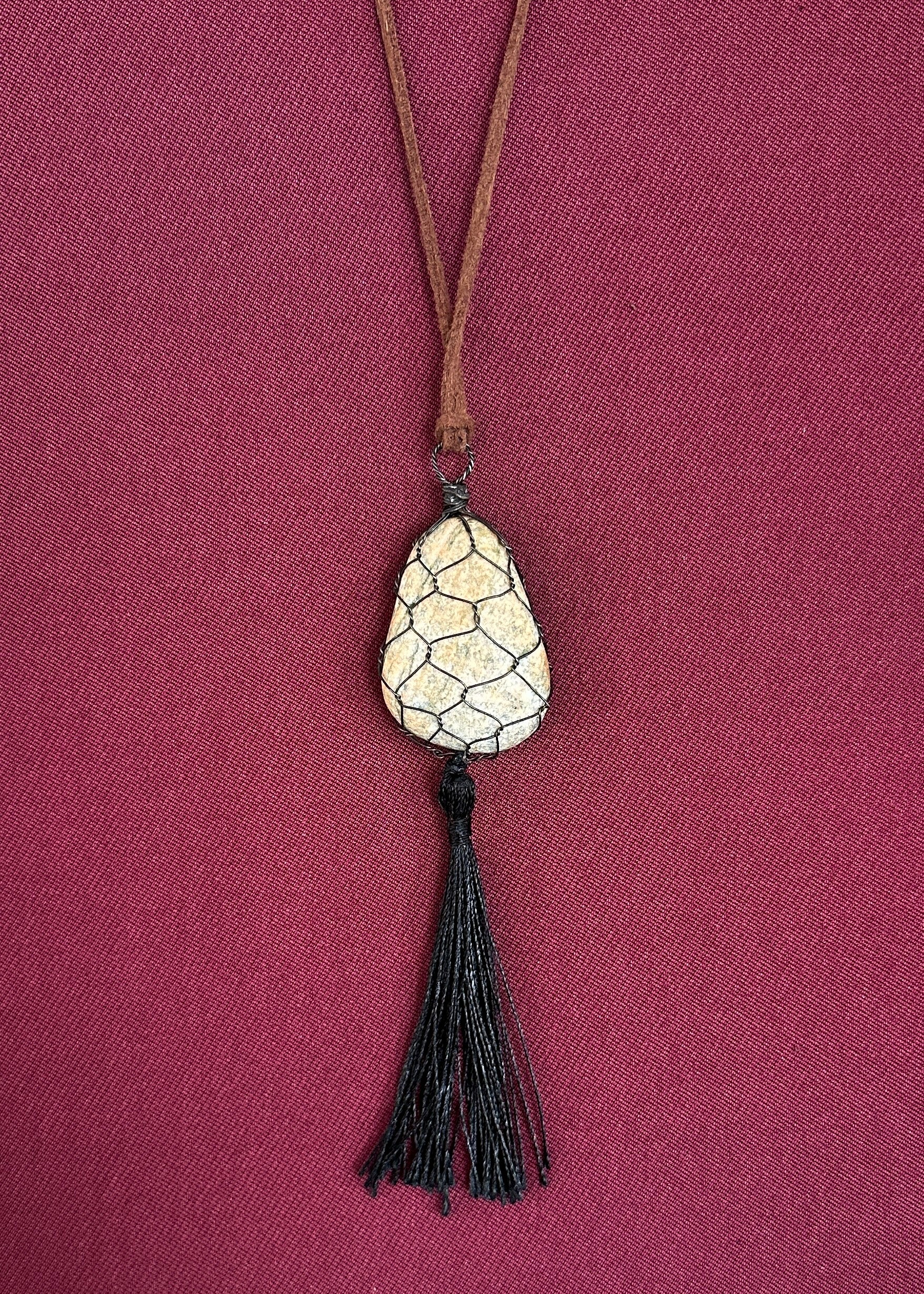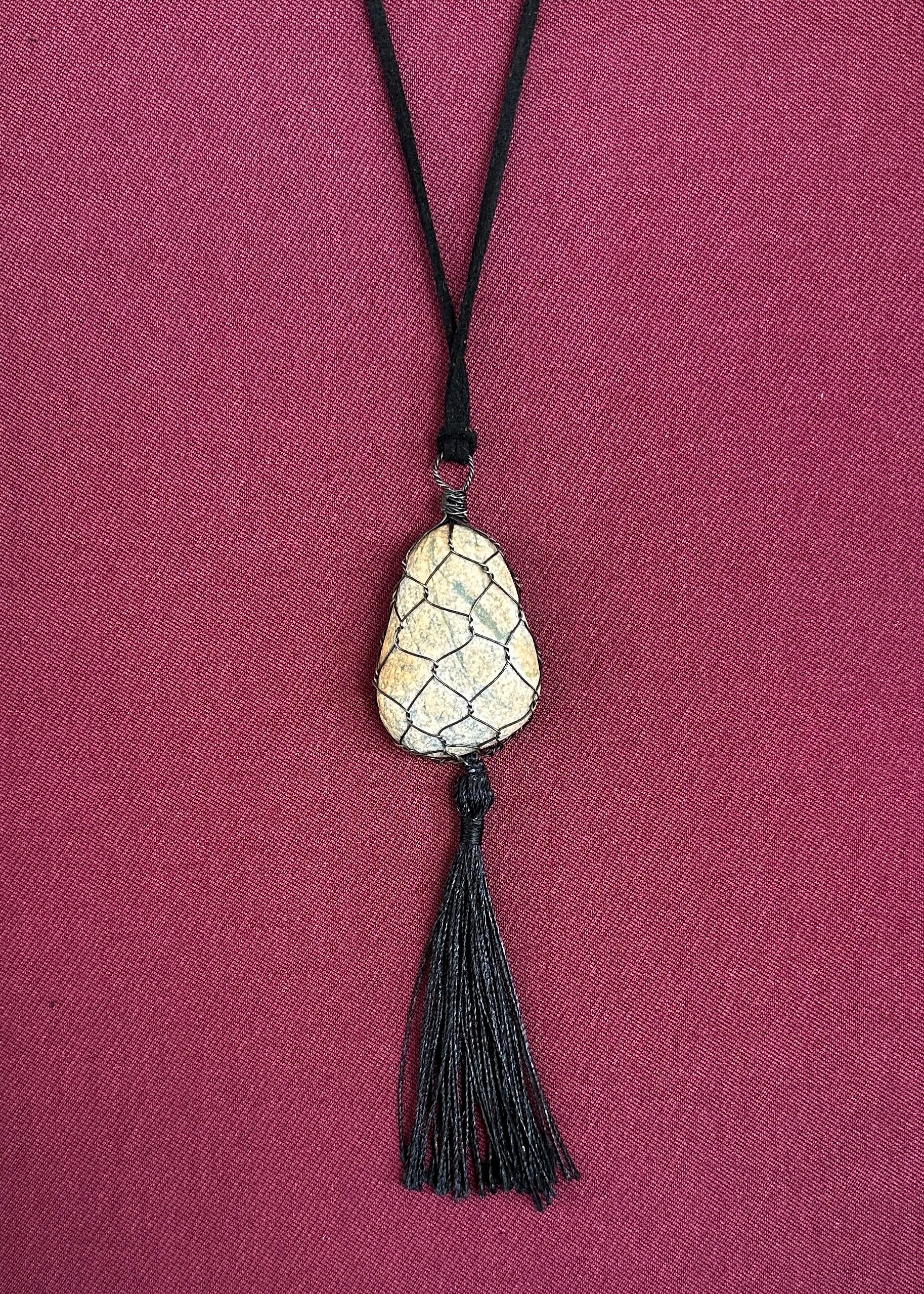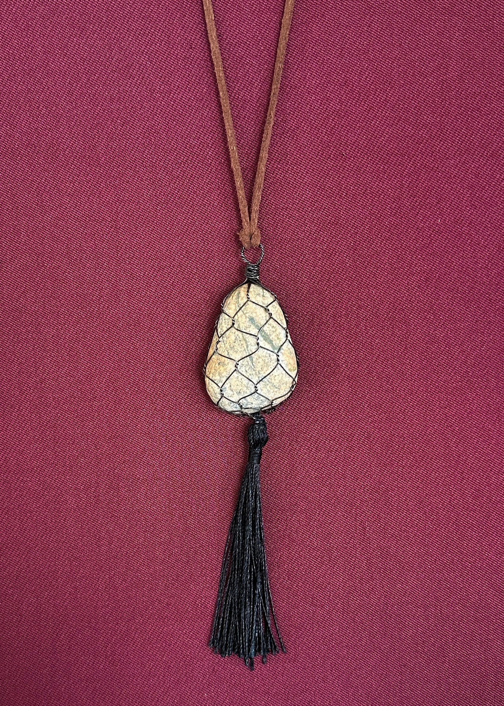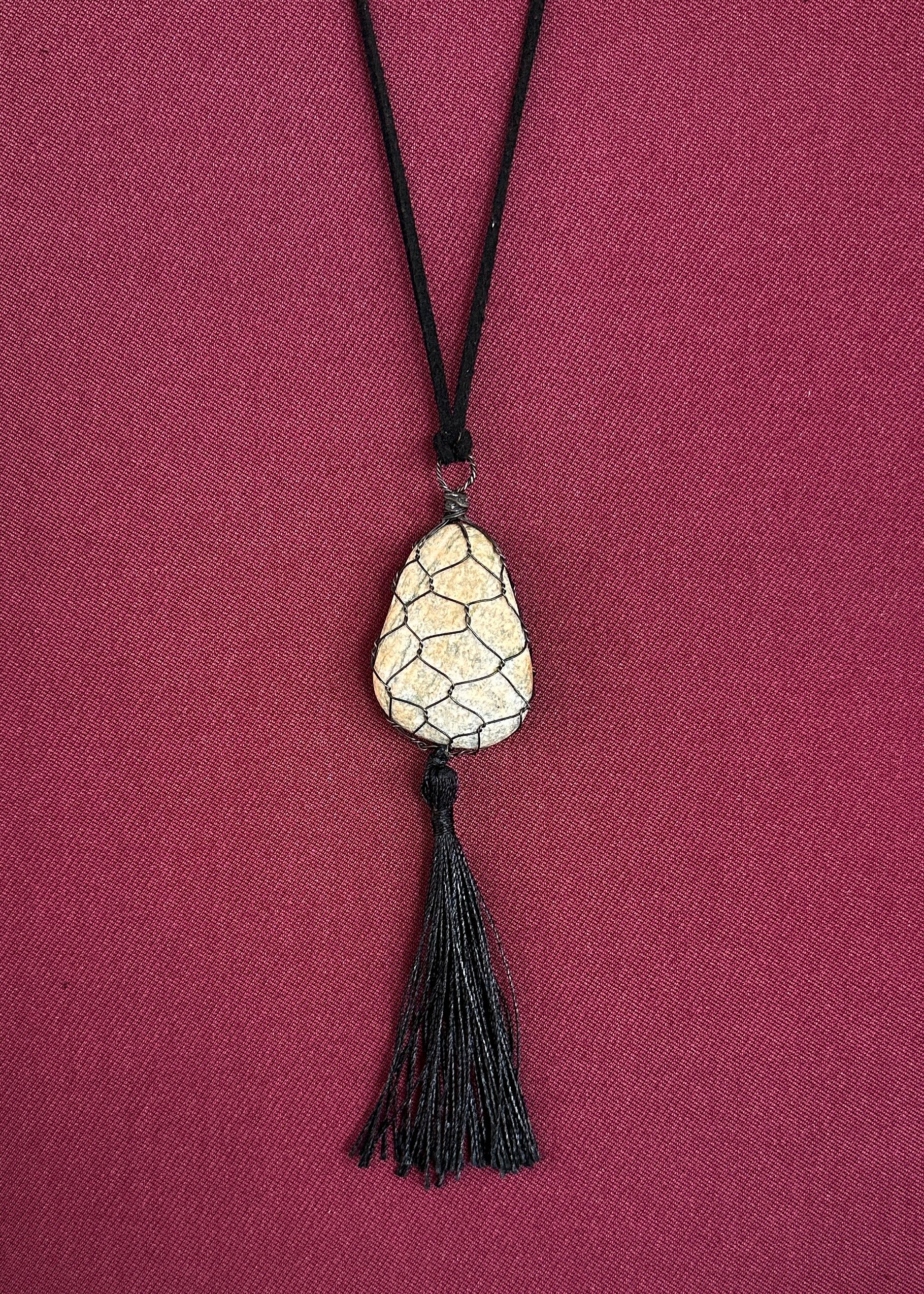 A mix of stone, wire, silky yarn, and leather come together in this one-of-one pendant. The soft leather cord measures 20 inches and adjusts easily for the perfect fit. Hand-wired and strung in New York City.