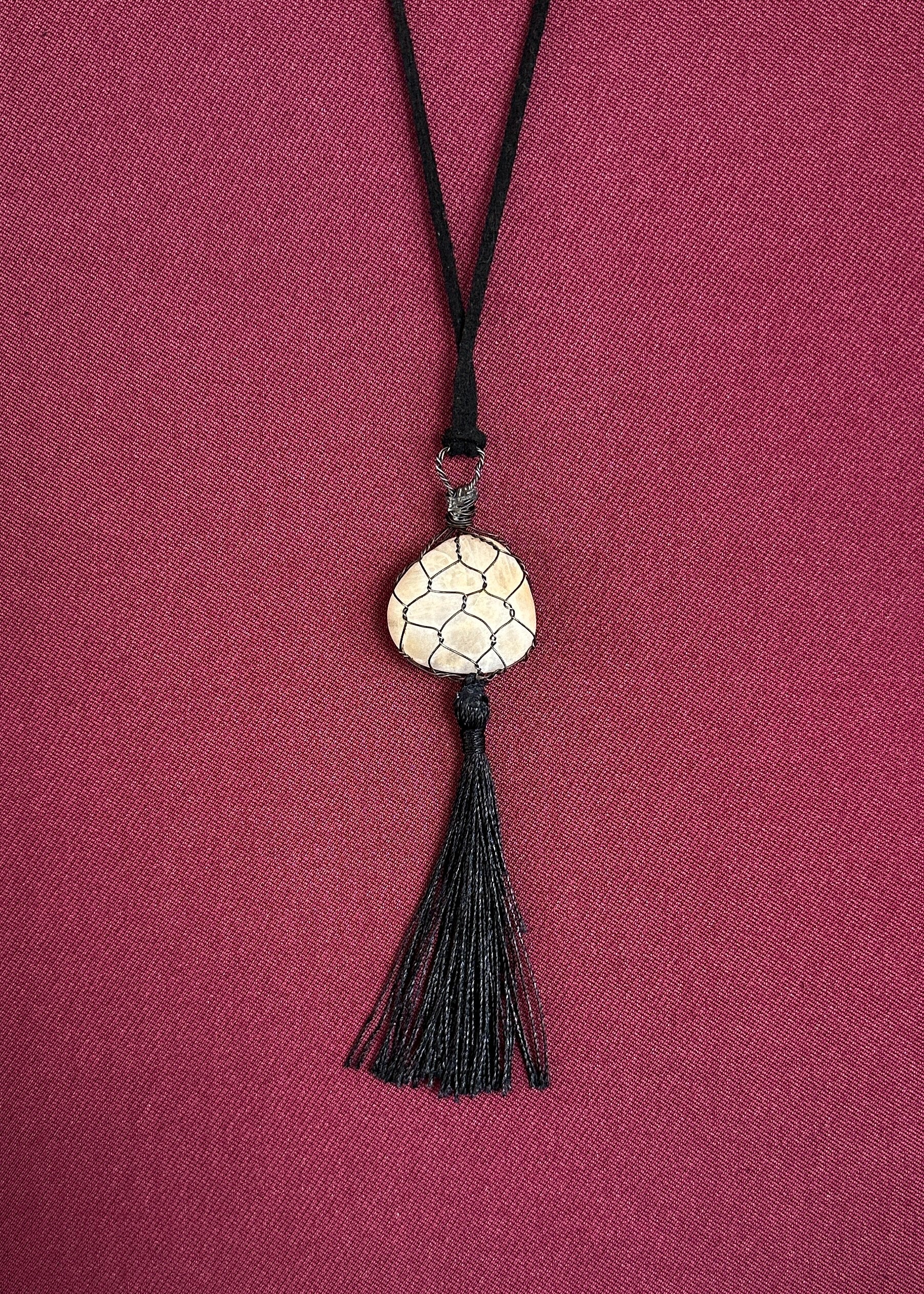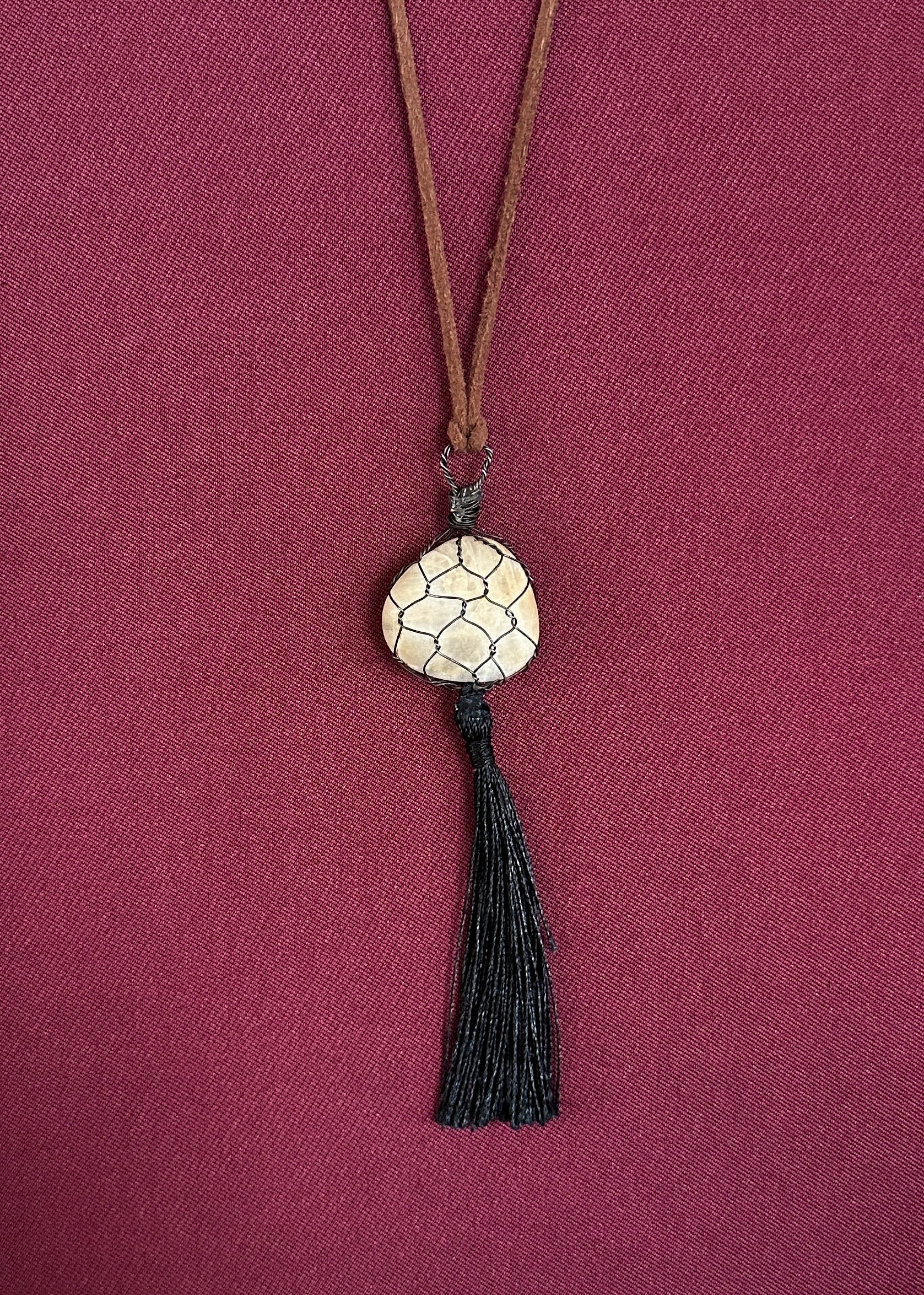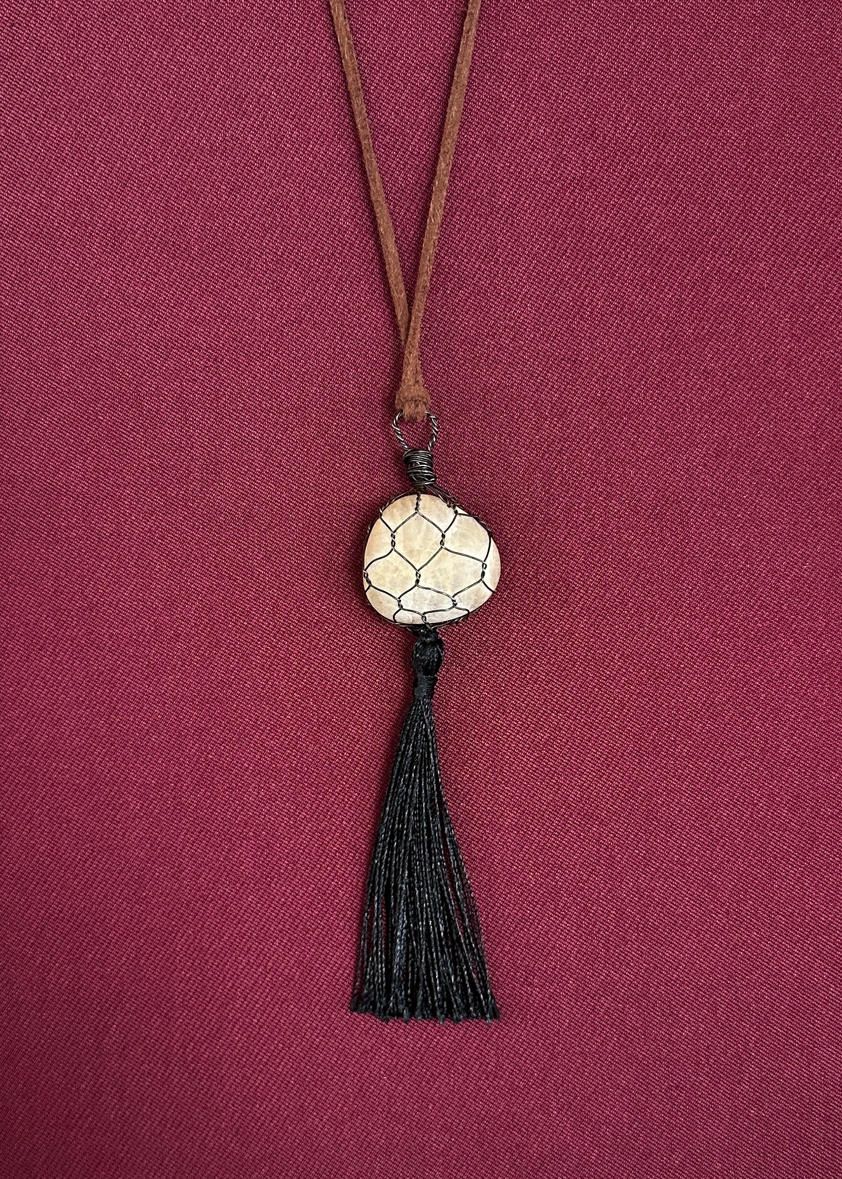 A mix of stone, wire, silky yarn, and leather come together in this one-of-one pendant. The soft leather cord measures 20 inches and adjusts easily for the perfect fit. Hand-wired and strung in New York City.