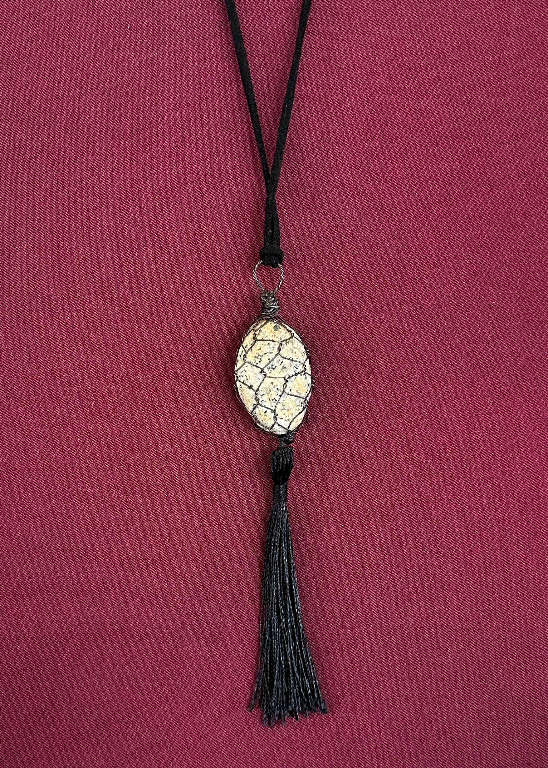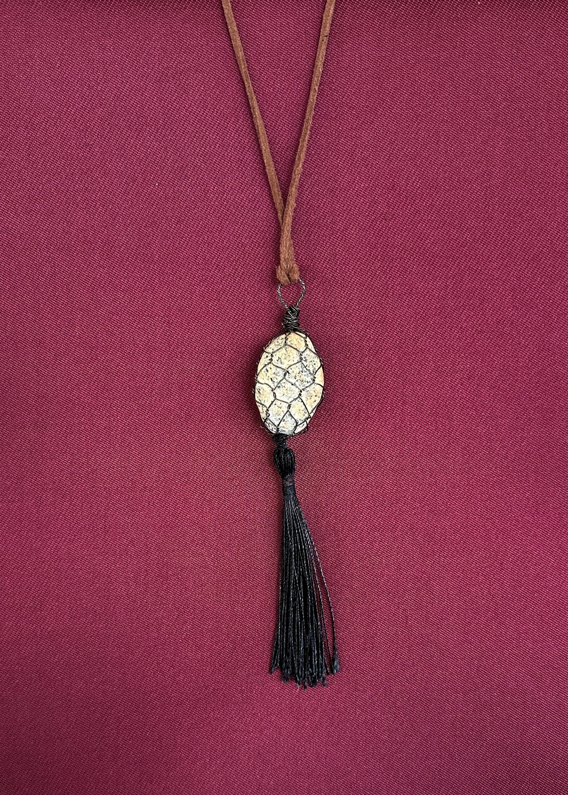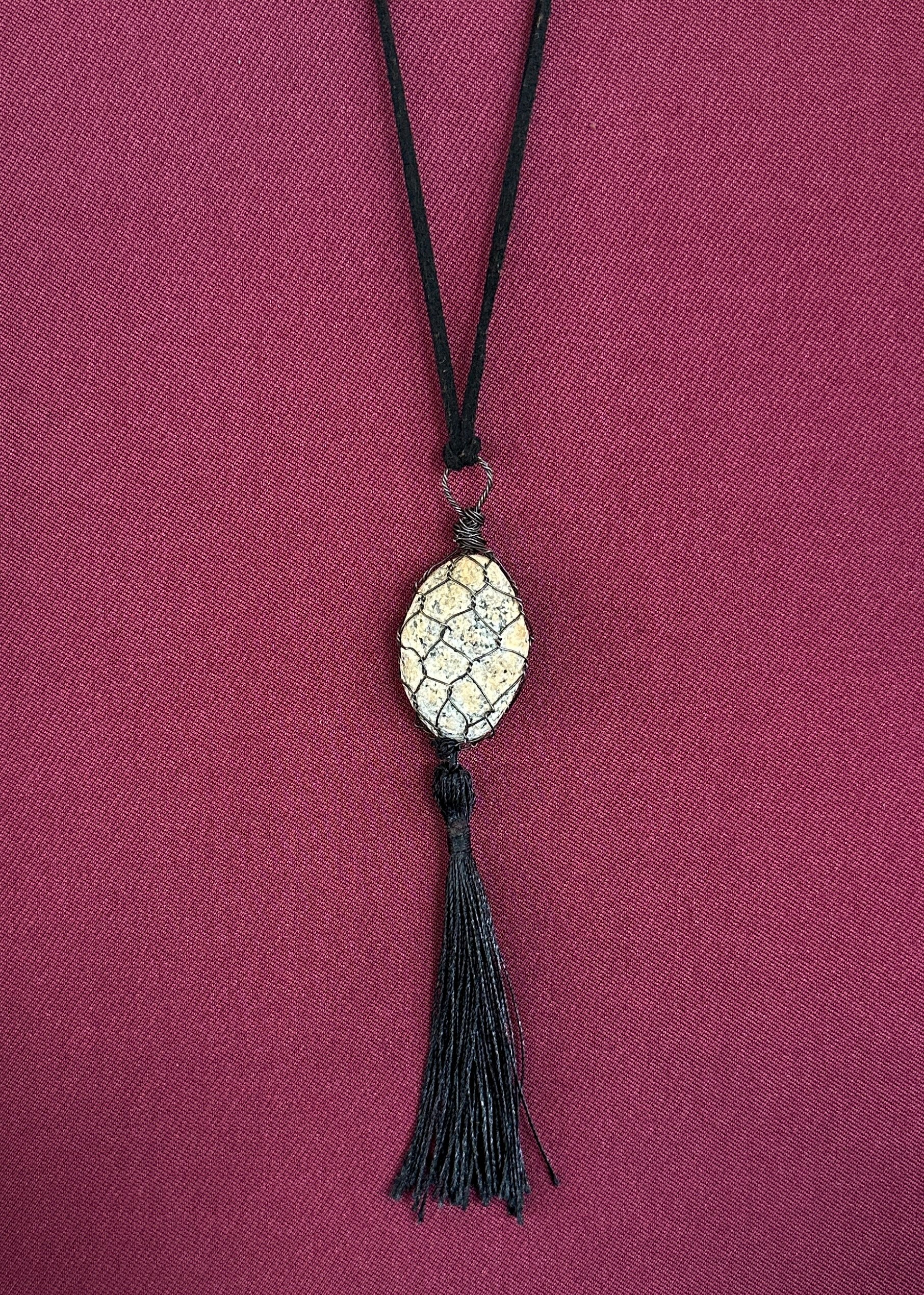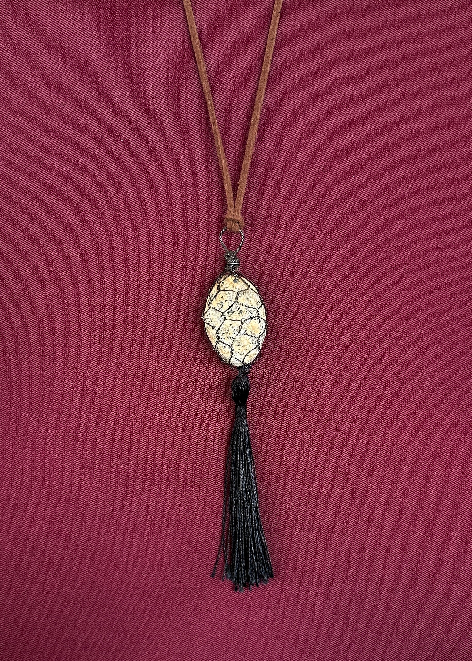 A mix of stone, wire, silky yarn, and leather come together in this one-of-one pendant. The soft leather cord measures 20 inches and adjusts easily for the perfect fit. Hand-wired and strung in New York City.